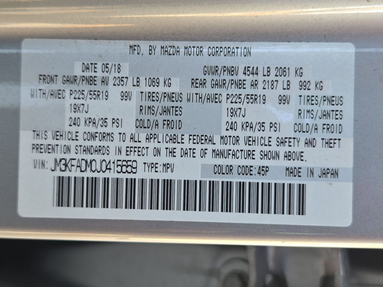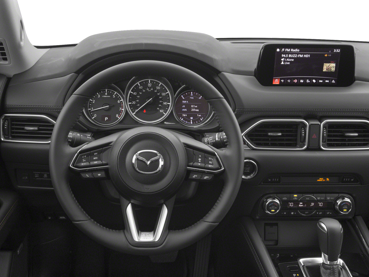 Equipped with 10 Speakers, 19 x 7J Aluminum Alloy Wheels, 4-Wheel Disc Brakes, 4.325 Axle Ratio, ABS brakes, Air Conditioning, Alloy wheels, AM/FM radio: SiriusXM, Auto High-beam Headlights, Auto-dimming Rear-View mirror, Automatic temperature control, Bose 10-Speaker Audio Sound System, Brake assist, Bumpers: body-color, Delay-off headlights, Driver door bin, Driver vanity mirror, Dual front impact airbags, Dual front side impact airbags, Electronic Stability Control, Emergency communication system, Exterior Parking Camera Rear, Four wheel independent suspension, Front anti-roll bar, Front Bucket Seats, Front Center Armrest, Front dual zone A/C, Front fog lights, Front reading lights, Fully automatic headlights, Garage door transmitter: HomeLink, Heated door mirrors, Heated front seats, Heated Front Sport Shape Seats, Illuminated entry, Leather Seat Trim, Leather Shift Knob, Low tire pressure warning, Mazda Navigation System, Memory seat, Navigation System, Occupant sensing airbag, Outside temperature display, Overhead airbag, Overhead console, Panic alarm, Passenger door bin, Passenger vanity mirror, Power door mirrors, Power driver seat, Power Liftgate, Power moonroof, Power passenger seat, Power steering, Power windows, Radio data system, Radio: AM/FM/HD Audio System, Rain sensing wipers, Rear anti-roll bar, Rear Bumper Guard, Rear reading lights, Rear seat center armrest, Rear window defroster, Rear window wiper, Remote keyless entry, Roof Rack Side Rails, Speed control, Speed-sensing steering, Split folding rear seat, Spoiler, Steering wheel mounted audio controls, Tachometer, Telescoping steering wheel, Tilt steering wheel, Traction control, Trip computer, Turn signal indicator mirrors, Variably intermittent wipers, and Wheel Locks.