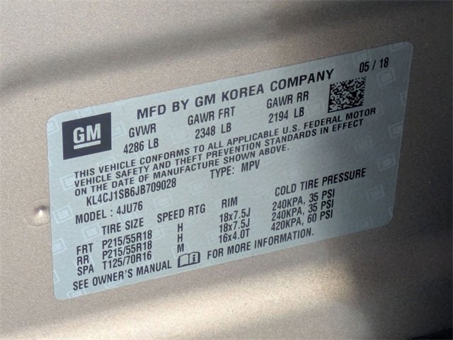 Equipped with Encore Sport Touring Package (Rear Sport Spoiler), Preferred Equipment Group 1SH (Front Fog Lamps and Remote Vehicle Starter System), Safety Package (120-Volt Power Outlet, Rear Cross-Traffic Alert, and Side Blind Zone Alert), 2-Way Manual Front Passenger Seat Adjuster, 3.53 Final Drive Axle Ratio, 4-Wheel Disc Brakes, 6 Speakers, 6-Speaker Audio System, 6-Way Power Driver Seat Adjuster, ABS brakes, Air Conditioning, Alloy wheels, AM/FM radio: SiriusXM, Apple CarPlay/Android Auto, Brake assist, Bumpers: body-color, Cloth w/Leatherette Seat Trim, Compass, Delay-off headlights, Driver door bin, Driver vanity mirror, Driver's Seat Mounted Armrest, Dual front impact airbags, Dual front side impact airbags, Electronic Stability Control, Emergency communication system: OnStar Guidance, Exterior Parking Camera Rear, Front anti-roll bar, Front Bucket Seats, Front fog lights, Front reading lights, Front wheel independent suspension, Fully automatic headlights, Heated door mirrors, Illuminated entry, Knee airbag, Low tire pressure warning, Occupant sensing airbag, Outside temperature display, Overhead airbag, Panic alarm, Passenger door bin, Passenger vanity mirror, Power door mirrors, Power driver seat, Power steering, Power windows, Radio data system, Radio: Buick Infotainment System AM/FM Stereo, Rear seat center armrest, Rear side impact airbag, Rear window defroster, Rear window wiper, Remote keyless entry, Ride & Handling Suspension, Roof rack: rails only, Security system, SiriusXM Satellite Radio, Speed control, Speed-sensing steering, Split folding rear seat, Spoiler, Steering wheel mounted audio controls, Tachometer, Telescoping steering wheel, Tilt steering wheel, Traction control, Trip computer, Turn signal indicator mirrors, Variably intermittent wipers, and Wheels: 18 Midnight Silver Aluminum Alloy.