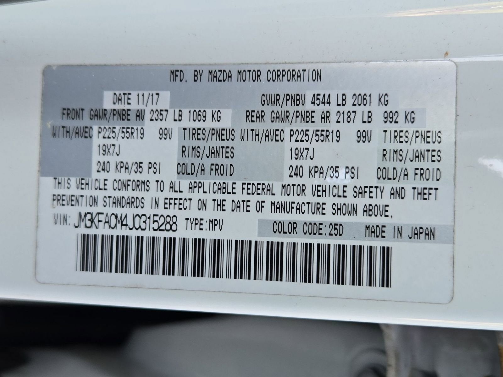 Equipped with Preferred Equipment Package (Auto Dimming Rearview Mirror w/HomeLink, Bose 10-Speaker Audio Sound System, Mazda Navigation System, Power Rear Liftgate, and Power Sliding-Glass Moonroof w/Interior Sunshade), 19 x 7J Aluminum Alloy Wheels, 4-Wheel Disc Brakes, 4.325 Axle Ratio, 6 Speakers, ABS brakes, Air Conditioning, Alloy wheels, AM/FM radio, Auto High-beam Headlights, Automatic temperature control, Brake assist, Bumpers: body-color, Delay-off headlights, Driver door bin, Driver vanity mirror, Dual front impact airbags, Dual front side impact airbags, Electronic Stability Control, Emergency communication system, Exterior Parking Camera Rear, Four wheel independent suspension, Front anti-roll bar, Front Bucket Seats, Front Center Armrest, Front dual zone A/C, Front reading lights, Fully automatic headlights, Heated front seats, Heated Front Sport Shape Seats, Illuminated entry, Leather Shift Knob, Leatherette Seat Trim, Low tire pressure warning, Occupant sensing airbag, Outside temperature display, Overhead airbag, Overhead console, Panic alarm, Passenger door bin, Passenger vanity mirror, Power door mirrors, Power driver seat, Power steering, Power windows, Radio data system, Radio: AM/FM/HD Audio System, Rain sensing wipers, Rear anti-roll bar, Rear reading lights, Rear seat center armrest, Rear window defroster, Rear window wiper, Remote keyless entry, Slowflake White Pearl Mica Paint, Speed control, Speed-sensing steering, Split folding rear seat, Spoiler, Steering wheel mounted audio controls, Tachometer, Telescoping steering wheel, Tilt steering wheel, Traction control, Trip computer, Turn signal indicator mirrors, and Variably intermittent wipers.