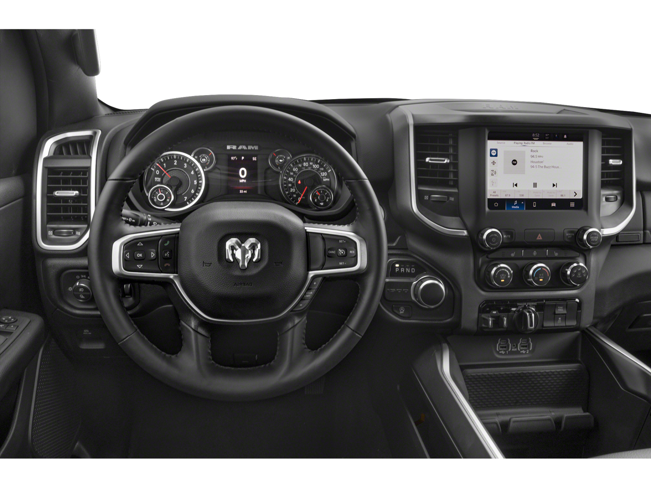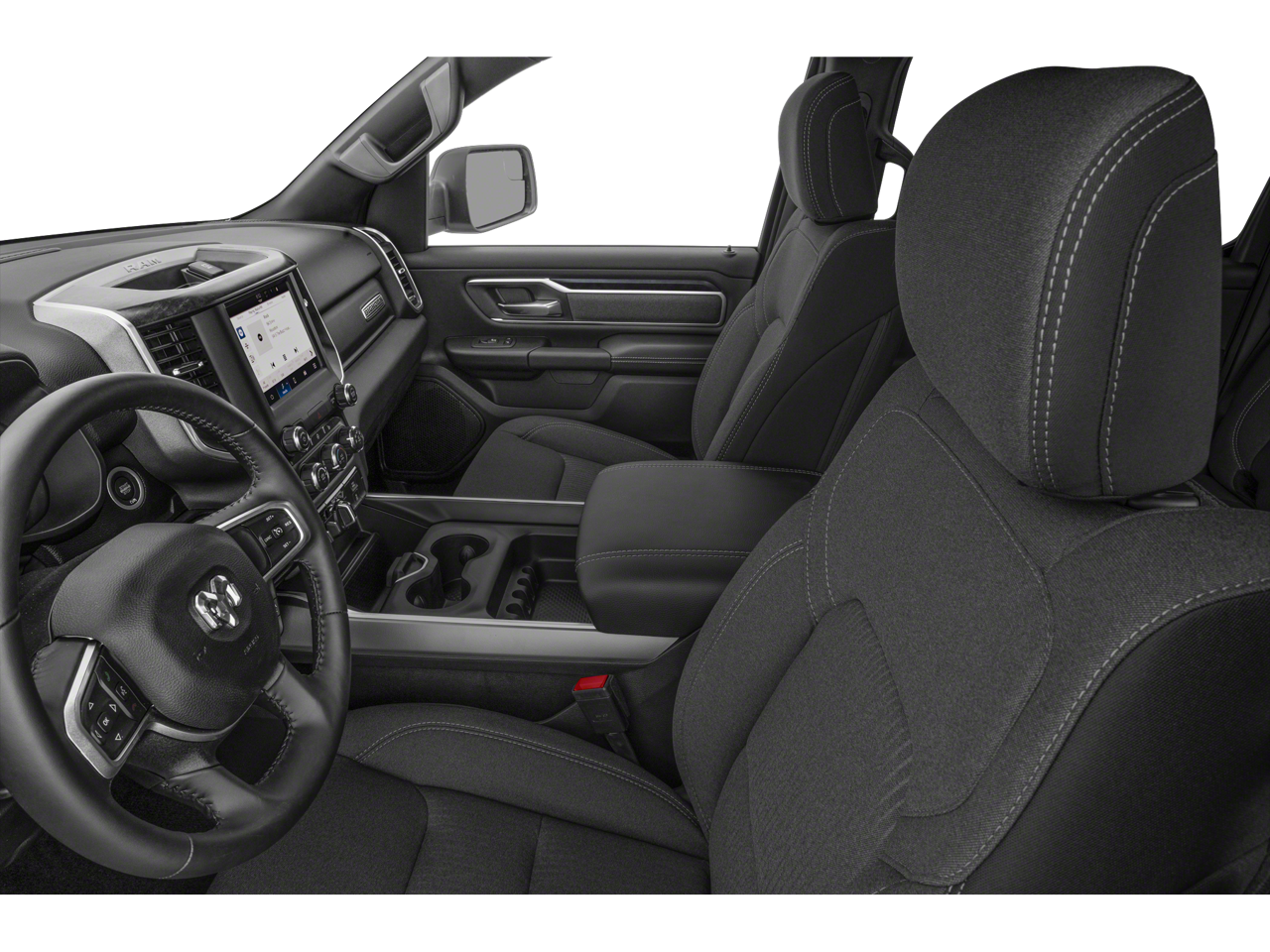Equipped with Big Horn Level 1 Equipment Group (2nd Row In Floor Storage Bins, 4G LTE Wi-Fi Hot Spot, Apple CarPlay, Auto-Dimming Exterior Driver Mirror, Auto-Dimming Rear-View Mirror, Black Premium Power Mirrors, Bluetooth® Handsfree Phone & Audio, Class IV Receiver Hitch, Connectivity - US/Canada, Convex Wide-Angle Exterior Mirror Insert, Electric Shift-On-Demand Transfer Case, Exterior Mirrors Courtesy Lamps, Exterior Mirrors w/Heating Element, Exterior Mirrors w/Supplemental Signals, For Details, Visit DriveUconnect.com, For More Info, Call 800-643-2112, Front Fog Lamps, Global Telematics Box Module (TBM), Glove Box Lamp, Google Android Auto, Heated Front Seats, Heated Steering Wheel, Passenger Sun Visor w/Illuminated Mirror, Power-Folding Mirrors, Radio: Uconnect 5 W w/8.4 Display, Rear Dome w/On/Off Switch Lamp, Rear Power Sliding Window, Rear Window Defroster, SiriusXM Radio Service, SiriusXM Satellite Radio, and USB Host Flip), Quick Order Package 23Z Big Horn (Big Horn Badge), Quick Order Package 27Z Big Horn, Sport Appearance Package (3 Rear Seat Head Restraints, 4 Way Front Headrests, Black Interior Accents, Body Color Door Handles, Body Color Exterior Mirrors, Body Color Front Bumper, Body Color Premium Power Mirrors, Body Color Rear Bumper w/Step Pads, Bucket Seats, Deluxe Cloth Bucket Seats, Front Seat Back Map Pockets, Full Length Floor Console, Grille Surround 1 Body Color Texture 2 Black, Manual Adjust 4-Way Front Passenger Seat, Power 2-Way Driver Lumbar Adjust, Power 8-Way Driver Seat, RAM Grille Badge - Chrome, Rear 60/40 Folding Seat, and Rear Center Armrest), Trailer Tow Group (Black Trailer Tow Power Mirrors, Trailer Brake Control, Trailer Light Check, Trailer Reverse Steering Control, and Trailer Tire Pressure Monitoring System), 3.21 Rear Axle Ratio, 4-Wheel Disc Brakes, 48V Belt Starter Generator, 6 Speakers, ABS brakes, Air Conditioning, Alloy wheels, AM/FM radio, Anti-Spin Differential Rear Axle, Brake assist, Bumpers: chrome, Cloth Bench Seat, Compass, Delay-off headlights, Driver door bin, Dual front impact airbags, Dual front side impact airbags, Electronic Stability Control, Emergency communication system: RAM Connect, Front anti-roll bar, Front Center Armrest w/Storage, Front reading lights, Front wheel independent suspension, Fully automatic headlights, Heated door mirrors, Illuminated entry, Integrated Voice Command w/Bluetooth®, Leather steering wheel, Low tire pressure warning, Manufacturer's Statement of Origin, MOPAR Front & Rear Rubber Floor Mats, Occupant sensing airbag, Outside temperature display, Overhead airbag, Overhead console, Panic alarm, ParkView Rear Back-Up Camera, Passenger door bin, Passenger vanity mirror, Power door mirrors, Power steering, Power windows, Radio data system, Radio: Uconnect 3 w/5 Display, Rear anti-roll bar, Rear seat center armrest, Rear step bumper, Remote keyless entry, Speed control, Split folding rear seat, Steering wheel mounted audio controls, Tachometer, Telescoping steering wheel, Tilt steering wheel, Traction control, Trip computer, Variably intermittent wipers, Voltmeter, Wheel to Wheel Side Steps, Wheels: 18 x 8 Cast-Aluminum Painted, and Wheels: 20 x 9 Aluminum Chrome Clad (WRK)