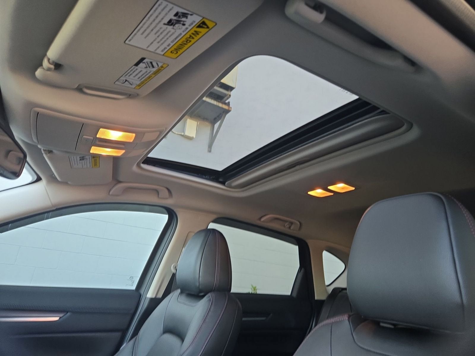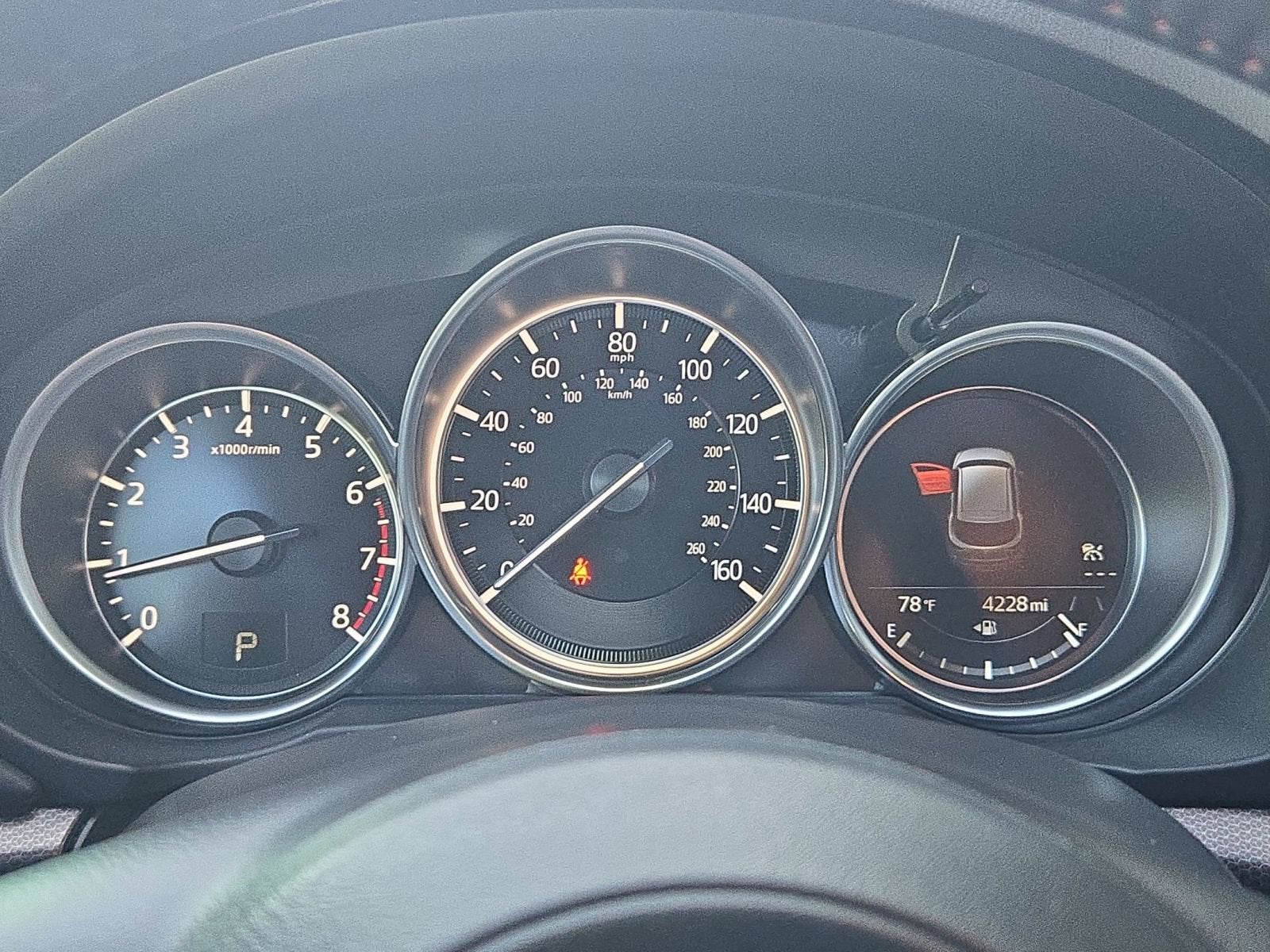 Equipped with 10 Speakers, 4-Wheel Disc Brakes, ABS brakes, Air Conditioning, All-Weather Floor Mats, Alloy wheels, AM/FM radio, AppLink/Apple CarPlay and Android Auto, Auto High-beam Headlights, Auto-dimming Rear-View mirror, Automatic temperature control, Black Lug Nuts & Black Wheel Locks, Brake assist, Bumpers: body-color, Delay-off headlights, Driver door bin, Driver vanity mirror, Dual front impact airbags, Dual front side impact airbags, E911 Automatic Emergency Notification, Electronic Stability Control, Emergency communication system: MAZDA CONNECT, Exterior Parking Camera Rear, First Aid Kit, Four wheel independent suspension, Front anti-roll bar, Front Bucket Seats, Front Center Armrest w/Storage, Front dual zone A/C, Front reading lights, Fully automatic headlights, Garage door transmitter: HomeLink, Heated Front Bucket Seats, Heated front seats, Illuminated entry, Infotainment System Voice Command, Leather Seat Trim, Leather Shift Knob, Leather steering wheel, Low tire pressure warning, Memory seat, Multifunction Commander Control, Occupant sensing airbag, Outside temperature display, Overhead airbag, Overhead console, Pandora, Panic alarm, Passenger door bin, Passenger vanity mirror, Power door mirrors, Power driver seat, Power Liftgate, Power moonroof, Power passenger seat, Power steering, Power windows, Radio Broadcast Data System Program Information, Radio data system, Radio: AM/FM/HD Audio System, Rain sensing wipers, Rear anti-roll bar, Rear reading lights, Rear seat center armrest, Rear window defroster, Rear window wiper, Remote keyless entry, SMS Text Msg Audio Delivery & Reply, Speed control, Speed-sensing steering, Split folding rear seat, Spoiler, Steering wheel mounted audio controls, Tachometer, Telescoping steering wheel, Tilt steering wheel, Traction control, Trip computer, Turn signal indicator mirrors, Variably intermittent wipers, and Wheels: 19 x 7J Aluminum Alloy.